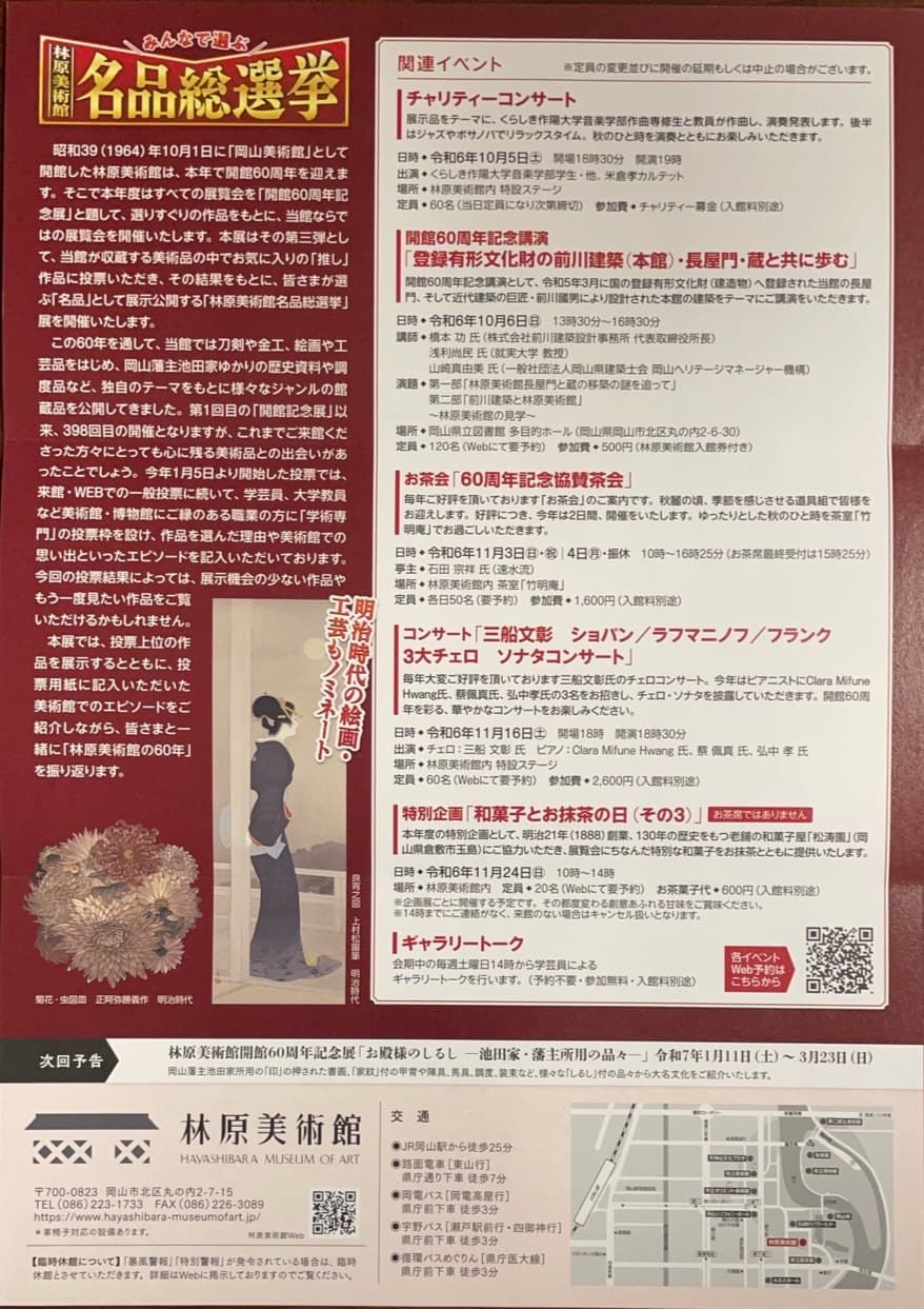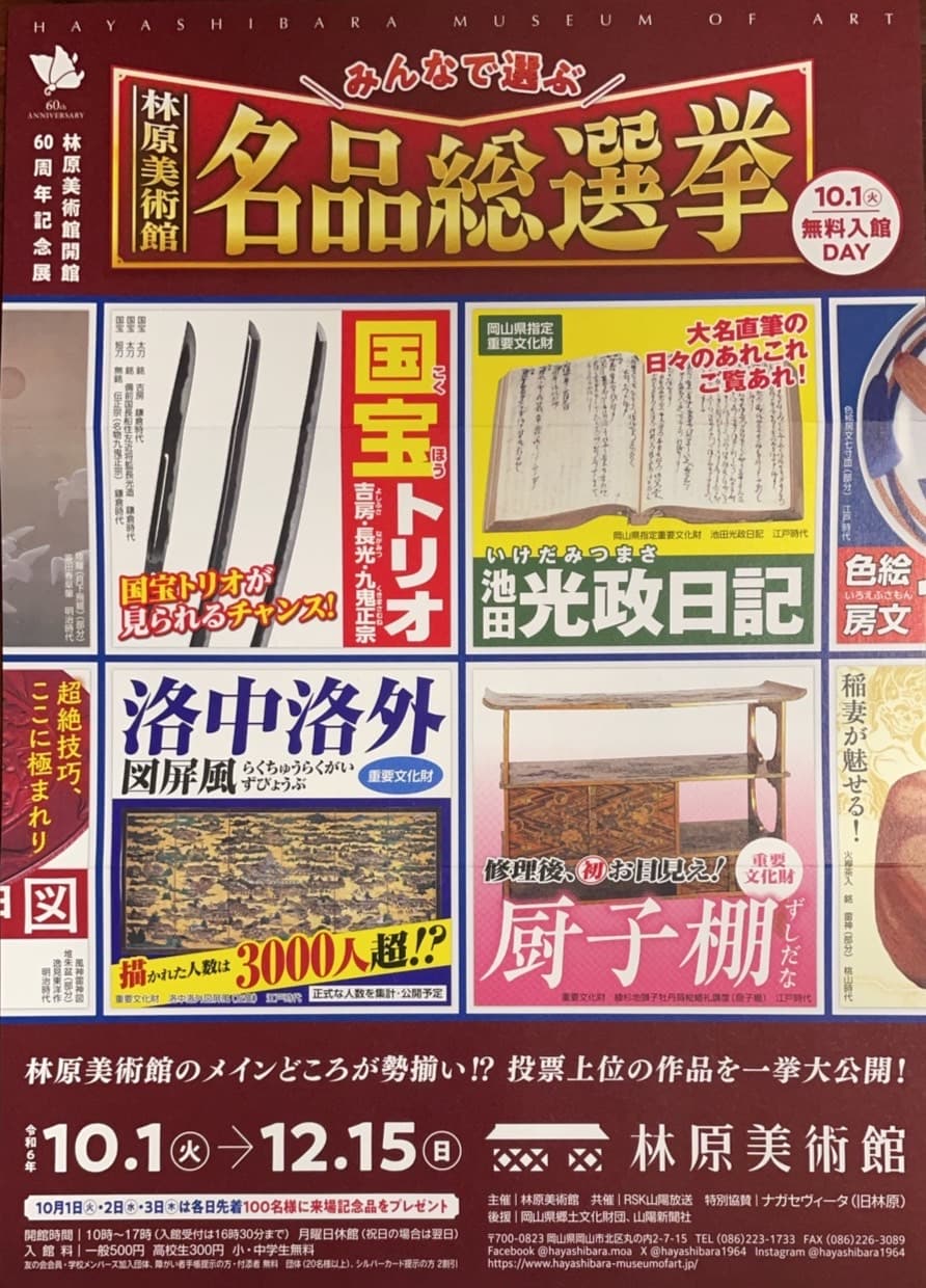 昭和39(1964)年10月1日に「岡山美術館」として開館した林原美術館は、本年で開館60周年を迎えます。そこで本年度はすべての展覧会を「開館60周年記念展」と題して、選りすぐりの作品をもとに、当館ならではの展覧会を開催いたします。本展はその第三弾として、当館が収蔵する美術品の中でお気に入りの「推し」作品に投票いただき、その結果をもとに、皆さまが選ぶ「名品」として展示公開する「林原美術館名品総選挙」展を開催いたします。